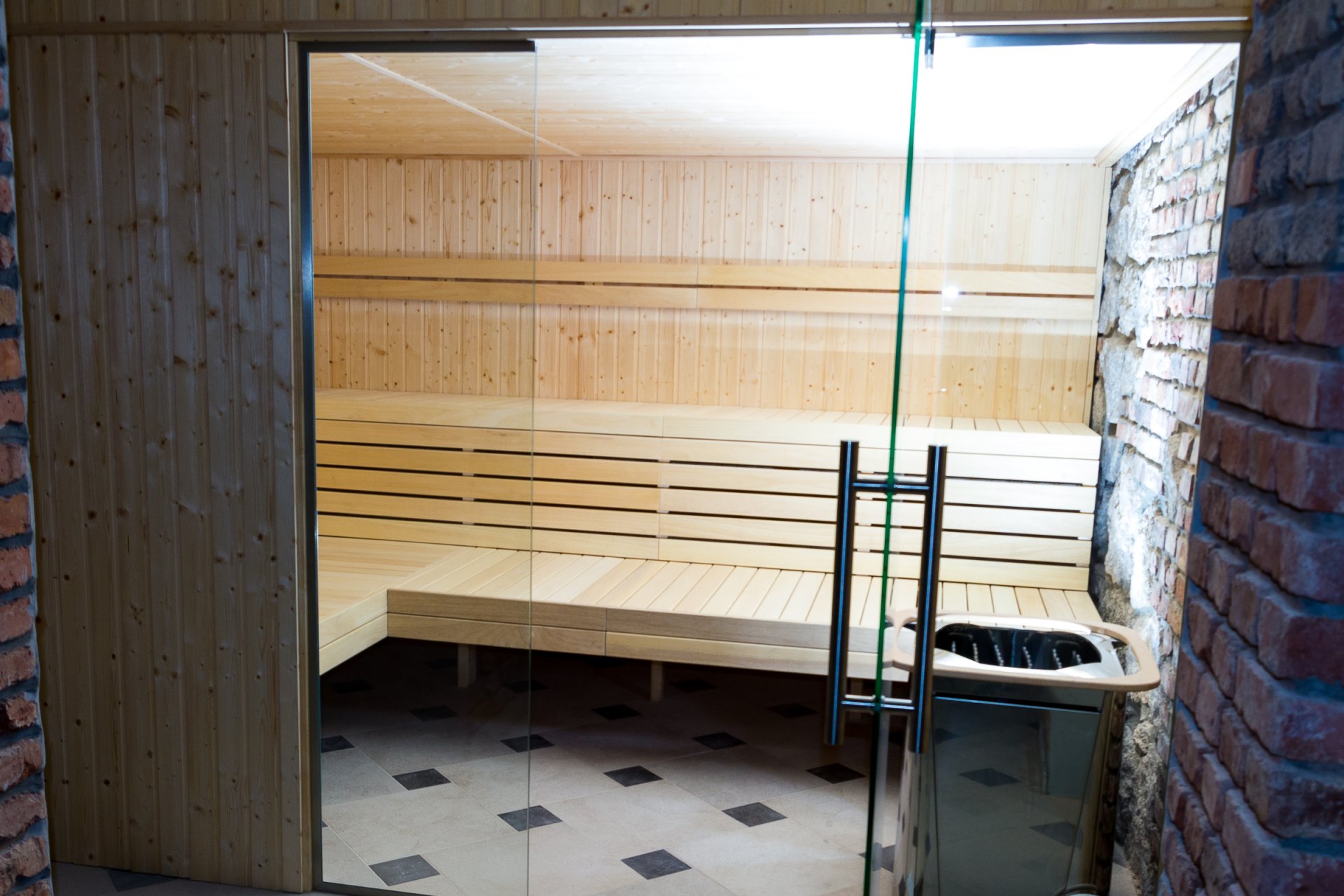 Wykonaliśmy strefę odnowy biologicznej w Szpitalu Bukowiec (Kowary k. Karpacza). Sauna wkomponowana została w mury zabytkowej części szpitala. Przednia ściana częściowo przeszklona. Siedziska z drewna abachi a wnętrze kabiny z drewna świerkowego.